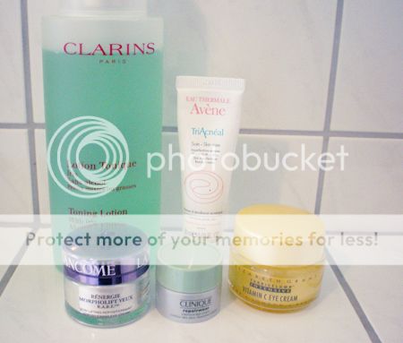 Als letzten Reinigungsschritt folgt noch das Clarins Iris Tonic. So werden die Poren wieder geschlossen und die Haut erhält einen Frischekick. Anschließend trage ich eine Augenpflege auf. Hier bin ich aktuell am Testen: Lancome Rénergie, Clinique Repairwear Intensive und Elizabeth Grant Vitamin C Eye Cream. Alle Augencremes haben unterschiedliche Konsistenzen. Je nach Bedürfnis wähle ich die passende aus. Schließlich lasse ich meine Haut ca. 30 Minuten ruhen bis ich Avene TriAcnéal als Pickelbekämpfung auftrage. Hierzu verlinke ich euch meine Review.