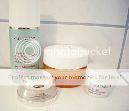 Morgens habe ich bisher meistens nur das Clarins Pore Minimizing Serum benutzt. Auch hier verlinke ich euch meinen Testbericht. Da ich aber, wie bereits erwähnt, mit einigen trockenen Stellen zu kämpfen habe, verwende ich an diesen Stellen eine Gesichtscreme. Meine Wahl ist hier auf die Shiseido Bio Performance Advanced Super Revitalizing Cream oder auf die Annayake Ultratime Cream gefallen. Beides sind Proben aus den Beauty Boxen von Douglas und sind mit einem Anti-Age Effekt ausgestattet. Also eigentlich nicht wirklich das passende für mich :P Abends benutze ich nach wie vor die Clarins Eclat du Jour Gesichtscreme. Mit ihr bin ich nach wie vor super zufrieden. Der Tiegel neigt sich so langsam sogar dem Ende zu.